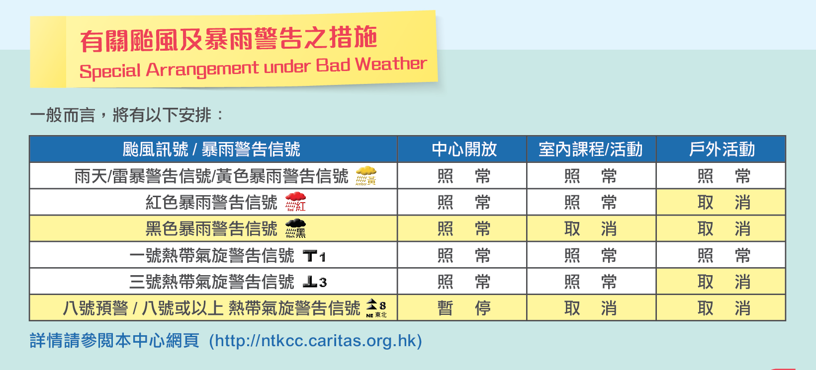 詳情請參閱本中心網頁 (https://ntkcc.caritas.org.hk) 之「會員需知」欄內的「特殊天氣狀況安排」或參考中心的面書(https://www.facebook.com/caritasNTKCC)。